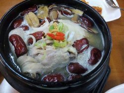 参鸡汤分很多种的,营养参鸡汤,一般吧,煮的火候不是很足,汤的味道还是比较香的,但是也比较淡,不是很油腻,鸡肉还是比较有嚼劲的,没什么味道,我不太喜欢,这个比较适合冬天喝,热乎乎的,泡菜饼,还不错,小辣,挺香的。烤五花肉,稍微的肥了一点,我觉得不够香,吃的很油腻,石锅拌饭还不错,辣酱的味道很地道,又辣又香很好吃。…查看更多