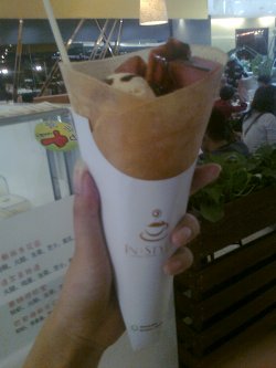 区龙之梦逛街的时候发现这家店门口有个可丽饼的小摊,看着很诱惑人,就想买个解馋。要了甜口加冰淇淋的那种,看着服务员当场制作,很放心。外皮比一般的可丽饼硬一点,也脆一点,里面的黄桃水果很新鲜,很好吃,冰淇淋也可以…查看更多