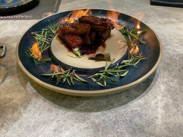 在深圳食米芝蓮級的新加坡FUSTION菜,價性比絕對超值。藍莓鵝肝:它是份開胃前菜,所以絕不是平常食那種一件鵝肝的,它是把鵝肝製成雪芭,配藍莓醬,以其獨特的口感令人驚喜。海南沙律:以草莓及芭樂等新鮮亞熱帶水果,配和獨特調味料及薑蓉,酸甜醒胃。天天海南雞拼燒雞:一次過可品嚐兩種製法的雞,海南雞與燒雞組合,帶來多層次的口感享受。黑磨鼓牛筋牛腩煲:用特製醬汁精心調製的牛筋牛腩,讓人回味無窮。鬼馬咕嚕肉:在傳統經典菜餚增添了一些新嘗試,就是加了香脆的油炸鬼,外脆內軟,甜甜酸酸。煙薰迷迭香火焰黑金叉燒,看似是普通的叉燒,但它製法新潮,上菜時以迷迭香火焰伴著,不但吸睛,一入口會讓味蕾驚艷不已。海南雜菜煲:集各類蔬菜於一體,形成營養豐富又美味的菜品。雞油飯:一整煲上的,香濃的雞油飯,將食物提升到新的高度。椰絲凍酸奶小白兔:作為甜點,可愛的白兔,不僅有視覺的吸引力,更為整餐畫上完美句號。南洋奶茶&咖啡-1950s: 帶有濃厚南洋風情的奶茶及咖啡。…查看更多
