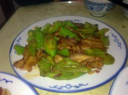 还好南方也有北方饺子馆,且让我试他一试!:)闲话少说,上菜。这个叫地三鲜,采用青椒+土豆+茄子。话说那叫一个油啊。。。