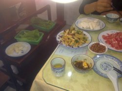 估计我还没起床他们仨就在锅里炖着了吧:)然后是饺子,采用饺子皮+饺子馅应该点的是猪肉芹菜的,不过炸过之后还是那一个字——“非常油”啊。以我的饭量,居然这点都有点抗拒了,头晕啊。。肝晕啊。。后悔得不行,应该搞清淡一点啊,明明是有煮的