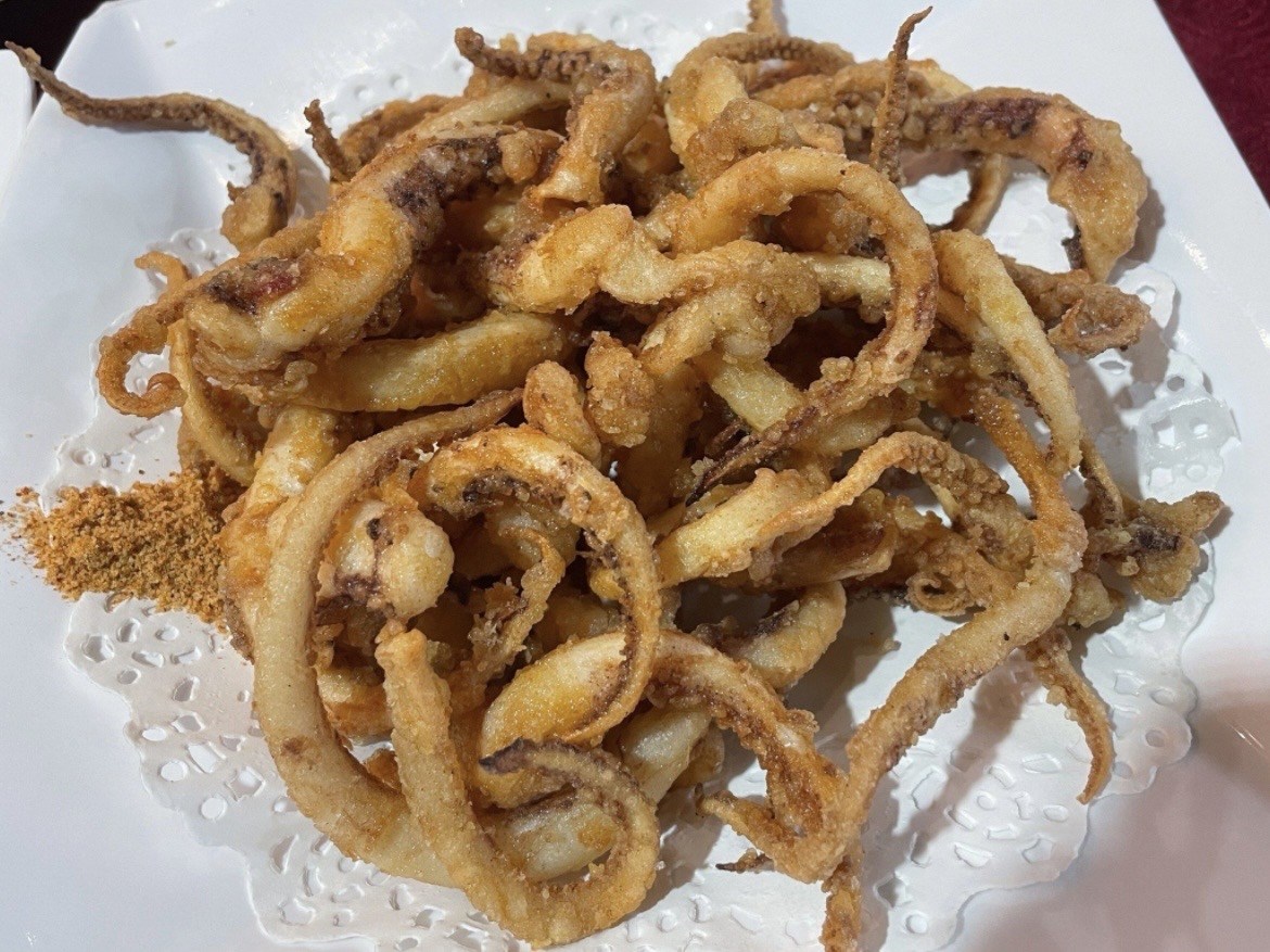 新鮮魷魚須現切現炸,裹上薄薄的澱粉糊,炸得外酥裡嫩,不會有厚重的面衣感。表面撒滿椒鹽和蒜末,香氣直沖天靈蓋,魷魚的鮮甜混合著椒鹽的鹹香,越吃越停不下來!