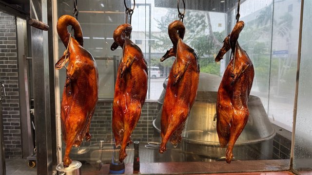 我們上次來這家餐廳是為了飲早茶,嚐了幾道點心。這次專程來外帶燒鵝和烤羊。他們的鵝是自養的,烤製工序接近完成時,我們帶了一整隻回家。另一道菜是現點現烤的羊排,選用內蒙古羊排以明火炙烤。這家餐廳的招牌菜眾多,除了雞與乳鴿廣受歡迎,還提供各式海鮮。當場試吃了現烤鵝腿,肉汁飽滿、外皮酥脆,最驚豔的是肉質鮮嫩卻不過鹹,咬下瞬間肉汁立即迸發。下次定要內用品嚐更多菜色。