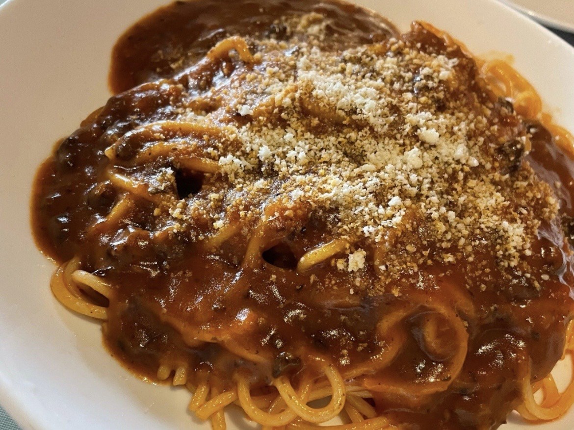 作為店內的人氣簡餐,茄汁肉醬燴意粉絕對是閉眼點不踩雷的選擇。手工熬煮的肉醬是靈魂所在,搭配酸甜濃郁的茄汁裹滿每一根勁道的意粉,香味層層交融,無論是午餐還是晚餐,都能給胃裡填滿暖暖的幸福感。