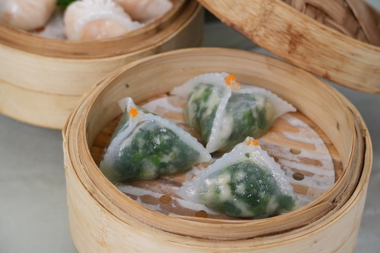 ②菠菜带子饺:新鲜菠菜制成的翠绿外皮,包裹整颗鲜甜带子,清香四溢;