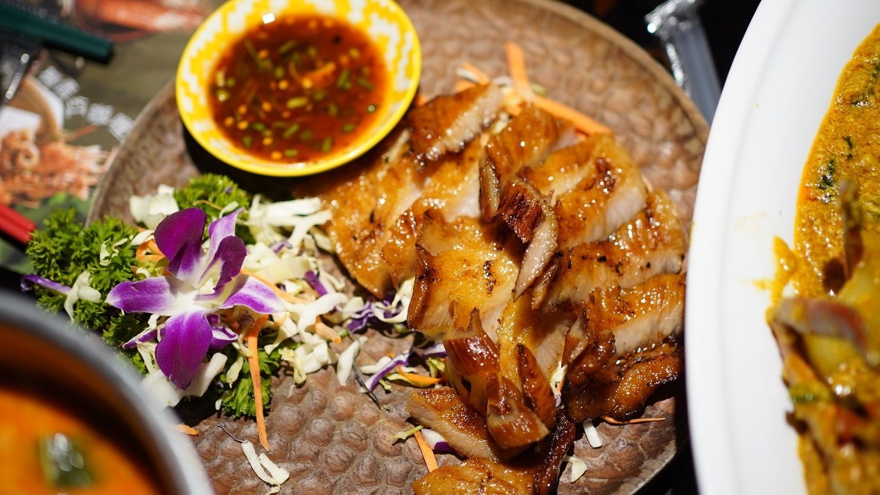 ②泰汁炭燒豬頸肉:外焦裡嫩的豬頸肉,裹上酸甜開胃的泰式醬汁,口感層次豐富,每桌必點;