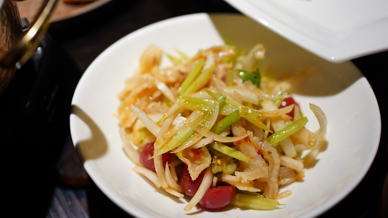 ④泰式無骨鳳爪+曼谷特色烤鱸魚:酸辣爽脆的鳳爪開胃解膩,烤鱸魚浸潤著泰式香料的獨特風味,魚肉鮮嫩多汁,閉眼點不踩雷~