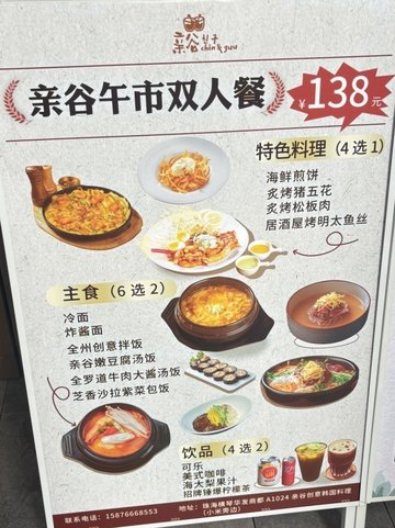 亲谷创意韩国料理 (横琴华发商都) (珠海) 网址: https://s.openrice.com/KtLS2G0cnsJ00 地址: 珠海香洲区横琴琴海路981号横琴华发商都北区1F层A1024号铺 电话: +86 15876668553