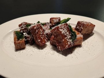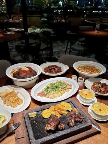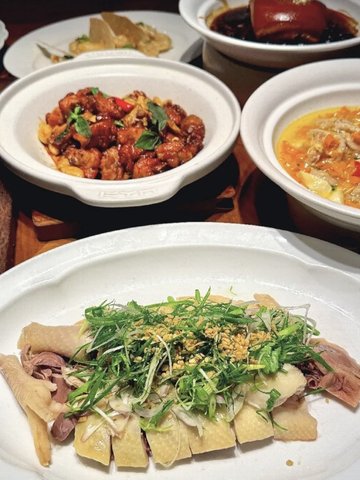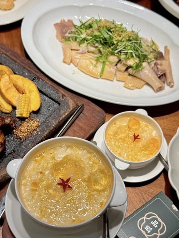 葱头油火腿紫菜焗饭 / 青芥芒果沙拉虾丸子 / 黑蒜糖醋排骨 / 石烹牛肋条 / 泡椒海鲈鱼雪花牛肉 / 杭椒年糕啫大肠头