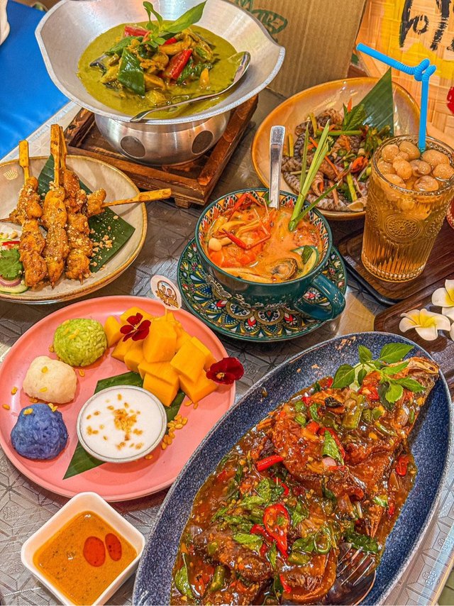 同成班朋友一齊食,叫到成枱都係食物 🤣 餐廳仲有道具比客人攞嚟影相打卡 。環境同氣氛都好似去到泰國一樣 又篤篤車頭喺門口 有沙灘遮沙灘枱凳裝飾 有大大個「泰國 Thailand」 標誌比客人影相 ,超有feel!