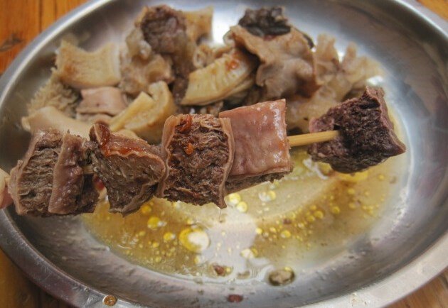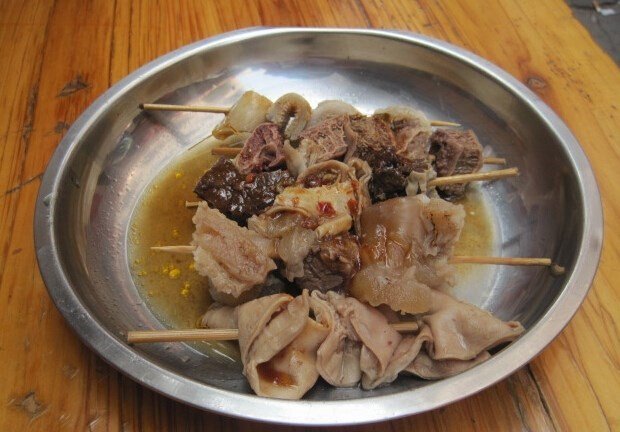 和广州一碗碗的牛杂不同,这边的牛杂都是一串串的卖