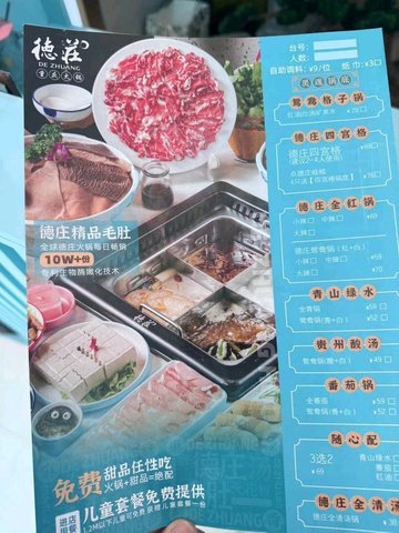 德莊手工蝦滑 / 鴛鴦鍋底 / 德莊毛肚 / 德莊爽滑牛肉 / 新鮮鴨血 / 成都空運鮮鴨腸