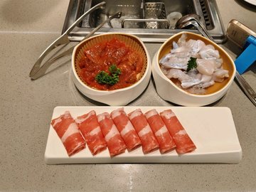 招牌蝦滑 / 番茄鍋底 / 精品肥牛 / 千層毛肚 / 現炸酥肉 / 清油麻辣鍋底