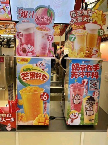 棒打鮮橙 / 蜜桃四季春 / 芋圓葡萄 / 芝士奶蓋蜜桃 / 奧利奧雪王大聖代 / 脆皮大聖代
