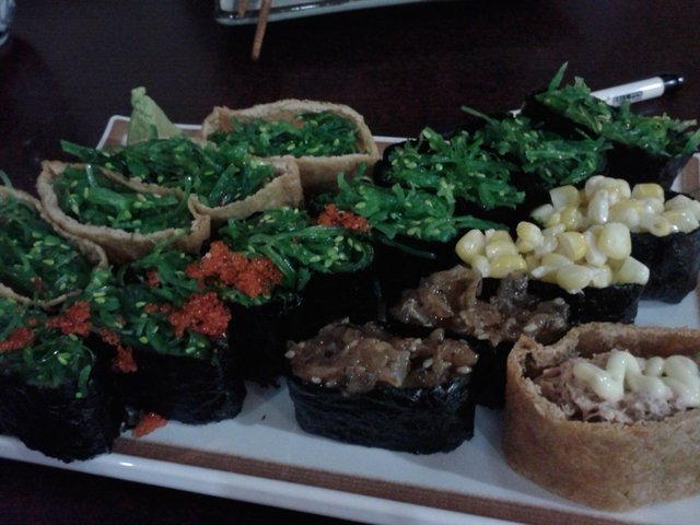东西上来的时候才发现我们居然选了那么多海草……然后发挥两个人变态的食欲,半小时把两大盘寿司,三个沙拉,几个手卷都吃完了。惊得服务员都愣了。