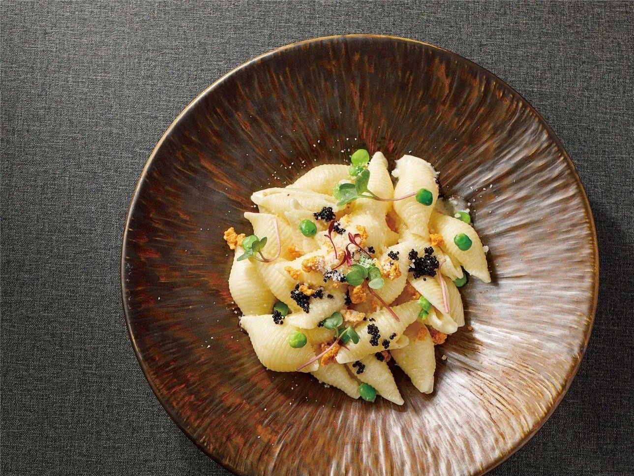 海膽貝殼面配甜豌豆及鱼子酱