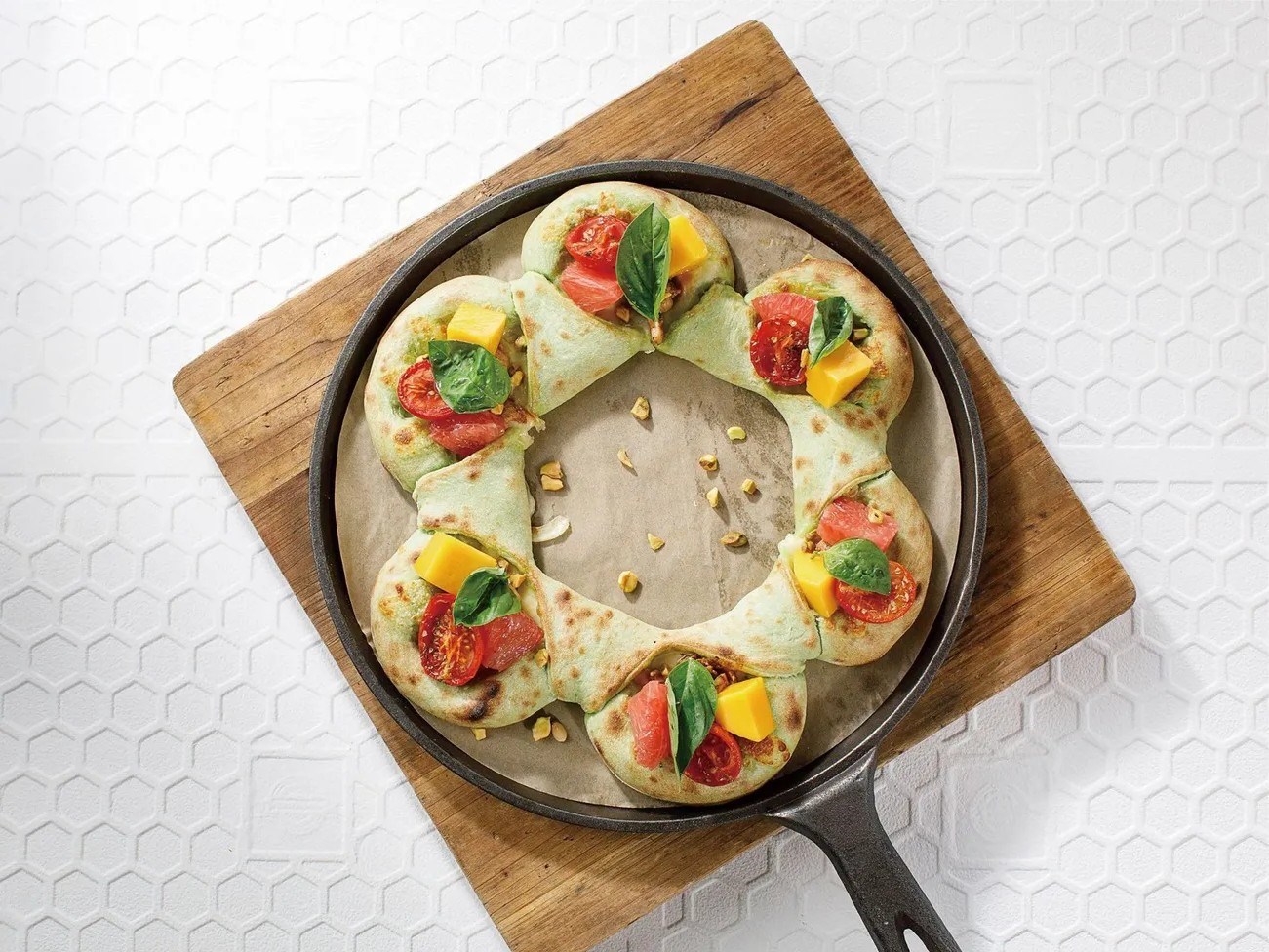 菠菜製成的披薩底帶著獨特的清新氣息,咬起來薄而有韌性,鋪在上面的肉料鮮嫩入味,搭配芒果塊的甜潤,再撒上榛子仁帶來的「咔嚓」堅香,每一口都是驚喜,很多人都說這款披薩打破了對傳統披薩的認知,清新不膩超解饞。