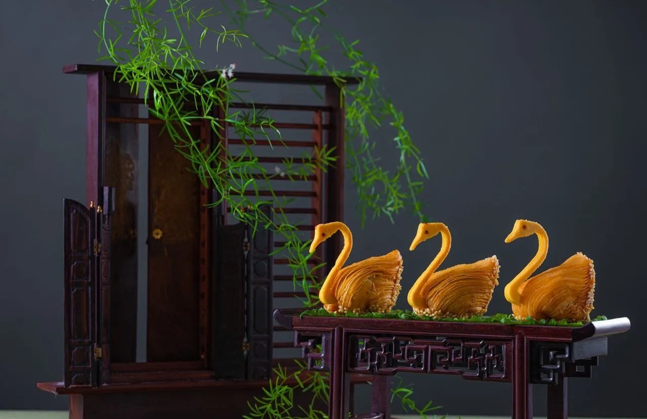 這道鮑魚天鵝酥堪稱可食用的藝術品:造型為栩栩如生的天鵝形態,金黃酥皮酥脆多層,內餡裹入鮮香鮑魚料,酥香與鮮味互為襯托,口感層次飽滿;其擺盤更襯以中式裝飾,視覺與味覺的體驗皆堪稱頂級,品嚐前不妨先留影記錄這份精緻。