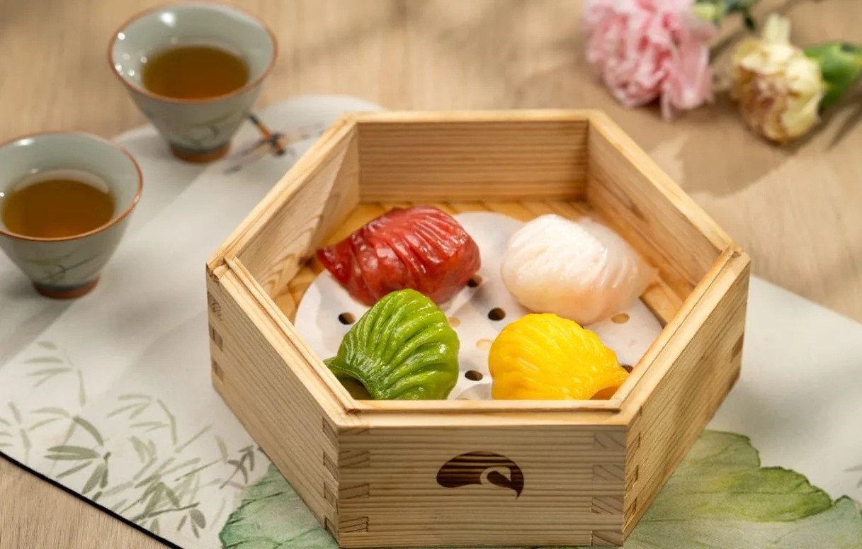 此款四色蝦餃全然突破傳統蝦餃的形制,一籠匯集紅、綠、白、黃四種色調,皆以天然食材調色,紅色取自紅菜頭汁,綠色源自菠菜汁,色澤清新且無額外添加。餃皮薄透如翼,輕咬之下,內裡飽滿的彈牙大蝦便顯露出來,鮮甜多汁,既具視覺美感,又承襲了粵式茶點的鮮味底蘊,可謂「顏味雙絕」。
