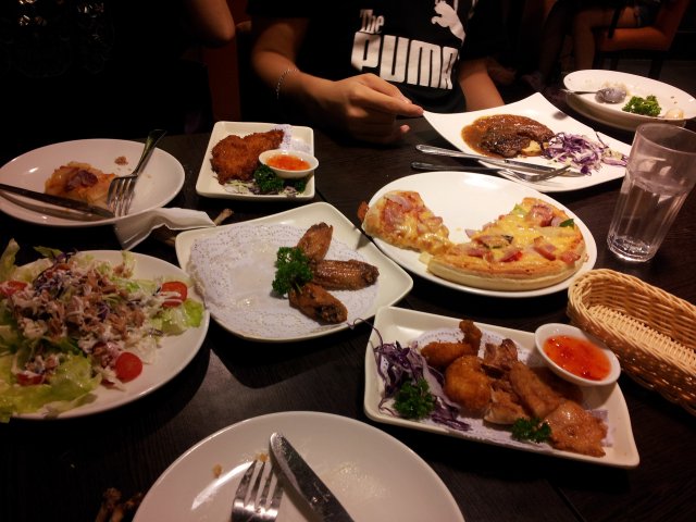 呢都环境都唔错,睇落都几舒服,不过过来吃嘢噶人似乎真系唔多。虽然话系西餐厅,但系出品感觉就好似快餐咁,基本都系好普通噶嘢。金枪鱼披萨,饼底真系几厚吓,而且味道唔够,一D都唔好吃呢;鸡蛋烟肉意粉,意粉比较幼,虽然滑但系唔够爽,意粉的酱汁味道好一般,口感麻麻地;水果沙拉,水果唔够新鲜,沙拉酱都唔多掂当。查看更多