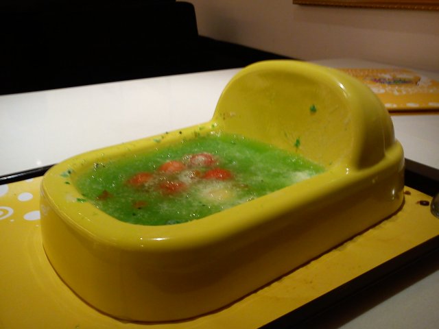 怪怪地餐厅,怪怪地食嘢! 大头唔见得系虾等級32012-07-2520 瀏覽 關注 上次朋友请去地王广场个间我冇去,今次话去时尚天河呢间新开噶系都拖住我去,讲真啦,唔想去主要就系心理接受唔到咁样形式噶餐厅,觉得好核突!但盛情难却今次都系去咗。 成间餐厅装饰到真噶好似洗手间咁样,墙上边仲挂埋D衫裤,虽然几干净,到处有光闪闪噶感觉,但仲系会有D讲唔清噶错觉产生。 坐噶凳,哦!唔系!系马桶,呢度噶凳都系马桶噶造型,台面系用尿斗勾住噶。下面话食噶嘢。马桶5号,其实就系朱古力雪糕,但整到果形状好似一督屎咁,味道就系一般噶雪糕来噶,并无咩特别。丝袜奶茶系用男厕所先有噶尿斗形杯装住,真系似模似样,咁样一杯18蚊一杯,奶茶味道比较淡味,呢个我饮唔落。鸡米花 同奶油意粉都系用“屎坑”装住噶,鸡米花几酥脆,奶油意粉好彩加咗烟肉同蘑菇,粉都冇咩味噶。成个餐食到老友话几得意,但我都系觉得怪怪地,咁样噶饮食文化睇来我咁样传统噶人系第一次都系最后一次。…查看更多以上食評乃用戶個人意見 , 並不代表OpenRice之觀點。讚好分享怪怪地餐厅,怪怪地食嘢! 便所餐厅 https://s.openrice.com/KtbT0m0ODm200檢舉 張貼 評分3味道3環境3服務3衛生3抵食用餐日期2012-06-10人均消費¥40