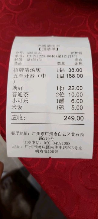 秋冬进补第一时间就霖倒吃羊,光明清汤羊已经听闻好耐,今次终于有机会来尝试一下。位置就在解放桥教附近,还算挺好找的,晚上未到6点来到就已经开始要等位了,可见这里不是一般的旺啊,好在预先预订了位置,否则也需要等位。这里的环境并不大,里面外面都坐满人,位置比较狭窄。   门口有一个透明的小厨窗式的厨房,师傅正在奋力砍羊。羊腩、羊肉、羊肠等等都很抢手的,要吃的就必须要预先叫定,否则迟了就什么都无啦!   我们吃的是四人套餐,有招牌清汤锅,五羊开泰拼盘,自制手打羊肉丸,羊血,羊肉松褒仔饭,杂菌拼盘。配备的酱料有豉油、豆腐乳。    首先上来的是招牌清汤锅,汤可以任加的,汤底有萝卜,羊骨,玉米等等,朋友说在吃之前一定要先饮上一口汤,这时的汤是最清纯的,都是老板用羊骨熬制的,饮上一口清甜可口,感觉都是萝卜玉米的味道比较大,没有什么羊肉味。   首先上来的是五羊开泰拼盘,有羊腩、羊肚、羊杂等等,羊肉和羊肚还是比较韧的,需要放入煲内慢慢煲,待煲淋、吸收了汤的鲜味再吃会比较好。    自制手打羊肉丸,由于没有了,所以更换了羊展,很有羊味,但相对来说比较韧。要注意一下不能涮太久。最好是涮10秒左右就吃,才能保持它的鲜嫩。    羊血,听讲很补的,吃上去的口感没有猪红这么嫩滑,稍微有少少谐和结实。   杂菌拼盘,有很多不同种类的菇,最后都没有吃完。   羊肉松褒仔饭,煲仔上,打开煲就闻到一股诱人的香味,羊肉碎与米饭混合在一起甘香无比,再带锅底少少的饭焦香味,无得弹。   后来肉不是太够,想再加单,很多招牌菜都没有了。最后再饮上一口汤,这汤浓缩了羊肉的味道,不骚,比之前的更香浓了。   总的来说味道不错,秋冬吃羊肉的好地方。查看更多