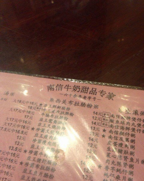 每次去南信都是排队的节奏,不是排队买票,就是排队等位,反正就是等等等。这里还很奇怪的,要自己拿桌面上的号码牌去买,第一次去的时候竟然还没留意桌面上的这个,结果去到收银台就囧了。不过收银MM身经百战,而且我们刚好坐在收银台附近,跟她指了指我们的位置她就知道了,马上下了单,还好。点了一碗姜撞奶,是招牌哦,等了一点时间,因为姜撞奶是即点即做的,讲求姜汁的多少与浓度,然后还有水牛奶的温度和撞的技巧,真是很费功夫的。一碗热腾腾的姜撞奶上来啦,滑滑的,姜汁很香很浓,配着牛奶吃简直是一流啊。11元一碗,比起某些小型甜品店要贵一点,不过物有所值啦,味道的确不错。…查看更多