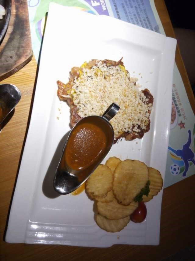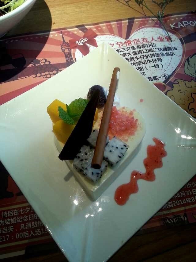 这间卡朋西餐是在东晓南路海珠新都荟三楼,就在必胜客的上面。经常路过,但都没进去消费过,原本中秋前夕午餐想在卡朋西餐解决的,但是拿号之后发现前面小桌的还有四十多个号,而且还有中桌和大桌的十几桌,太夸张了。于是忽略。后来,9月29日的晚餐就在卡朋西餐了。晚上六点多拿号,前面有6桌,但是等了超过30分钟。原来卡朋等位时间越久就越多优惠,毕竟它家是没有团购什么的,就会员优惠和等位优惠。等位超10分钟,盐酥鸡、芒果布丁、蓝莓苏打八折;等位超20分钟,海上鲜、原只鱿鱼、黑加仑益力多八折;等位超30分钟,送蔬菜春卷4块;超45分钟,送QQ蛋糕;超60分钟送小食拼盘。而且以上优惠是同享的。等了二十几分钟的时候,我居然想继续等几分钟,不能白白浪费啊,超30分钟就有炸春卷了,很纠结的心态!这是我第一次到卡朋西餐吃饭,之前也没去过别的分店。所以仔细地看了餐单,最后就选择了A+B1+C的套餐,36元。蔬菜春卷(4块),三星。赠送的,刚出锅,口感香脆,馅料是素的,对食肉兽来说还是没有含肉馅的春卷好吃。粟米汤,四星。配了一块面包,粟米汤味道中规中矩,但是不会太咸,所以我觉得比在其他地方的好喝。甜粟黑椒肥牛盖饭,三星。黑椒很多,所以较辣,肥牛就是平时打火锅的那种,黑椒肥牛加了点玉米粒。但是我不喜欢将太多的酱汁浇在米饭上面,要是能分开盛放就好。配的小菜是泡菜和青菜,味道都不错,特别是泡菜,辣辣的很开胃。柠檬茶,两星。最后才上饮料,几片新鲜柠檬加康师傅冰红茶吧,红茶味道很甜,上面的冰块也很多。店内的环境OK吧,就是比较挤,特别是两人桌的地方,走进去都很容易碰到正在进餐的客人。装修OK,但是环境真的很吵,比一般的快餐店还要吵,想安静说话是不大可能的。店员的服务OK吧,反正我在落地玻璃附近,经常看到的是收拾桌子的阿姨,其他的很难看到,除非是上菜。价格OK,部分菜品有会员价,但是会员卡要花100块钱换两张50元现金券,还要正价消费满100还是多少,而且次日才能用,还得一个月内用完两张的。想了一下就没要会员卡了,要是忘记到店消费就浪费了。…查看更多