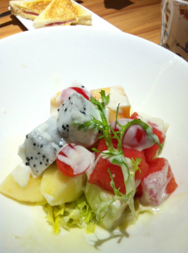 哈哈。我发觉我真的是卡朋的粉丝啊。几乎每家分店都去过啦。最近一次聚会,我说去卡朋吧。朋友提议来新都荟这家。好吧。我听都没听过。囧。千里迢迢来到新都荟,这里交通挺方便啊,地铁好像东晓南站。公车站是晓港湾站,一下车就到了。新都荟好像是新开的,里面装修不错,也有很多食肆,由于新开,基本都有优惠。卡朋在三楼,不同于其他分店,这里的门面很大,里面比较宽敞,位置也宽,不会很挤,环境真的还不错。我们人多,就坐在靠近门口的六人桌,所以我没进去里面看哇。但我周围的就感觉挺宽敞,坐着挺舒服。拍了墙上的东东,哈哈。环境不错,但这里的服务员就不是很给力啦。貌似都是说国语的,不过这个问题倒也不是特别大,问题是。。一个个都呆呆的,叫了好久才过来,居然还漏了下单。上菜速度还是可以的,除了我那份。囧。我去到的时候,朋友们都点了下午茶餐,下午茶餐挺划算的,十几二十就可以吃得很丰富了。他们点了三文治+奶茶+水果沙拉,鱿鱼须+饮料+水果沙拉,还有火腿煎蛋什么的。去得晚,好多他们都吃完啦。水果沙拉,卖相很好哦,分量也足,这是已经吃掉一半的了。水果种类挺多的,有苹果,番茄仔,番石榴,西瓜,火龙果。都很新鲜。三文治什么的,我没拍,味道不错哦,里面有火腿芝士。面包是烘过的。鱿鱼须,分量足,好像是23,有会员卡是19?忘记了。味道还不错,但是不够硬身,软软的,粉都散掉的感觉。有点小辣。盐酥鸡,也是十几块钱吧。分量还可以,口感比较硬,感觉没其他分店的好吃。配的酱挺好吃的。哈哈我叫了一个牛肋条套餐,45块钱。一份牛肋条,柠茶还有南瓜汤南瓜汤第一个上,口感不错,算绵滑的,南瓜味浓,甜甜的,颜色也很漂亮。。配的包不错,很脆。然后是柠茶。。要了少冰,还好真的有给我少到冰。哈哈。柠檬挺多的哈。最后是我的牛肋条。。等了半个多钟!!!这牛是迷路了么。。三条牛肋条。感觉分量比其他分店小了点。味道还是挺不错的。有嚼劲,牛肉香,中间还有筋,好香。如果有配饭或者意粉就更好了。BF的培根肉酱焗饭。26吧。感觉一般,分量比较小。肉酱挺多,酸酸甜甜的,他最爱。。饭多一点就好了。朋友的泰式炒饭,也是套餐来的。他叫了柠檬茶,玉米汤。泰式炒饭挺好吃啊,我之前吃过。哈哈。有点辣辣的,很惹味,里面海鲜料挺足,有吓人,墨鱼,蟹柳等等。他的玉米汤。这个是玉米肥牛盖饭。好吧。这一点都不像是盖饭好吗!肥牛分量还挺足的哈。味道也不错。总体来说,卡朋的出品还是挺不错的啦。这家新店的服务质量有待提高啊。最后买单200多吧。送了两张满100减30的券。好远哦,下次应该不会来这里吧。哈哈。…查看更多