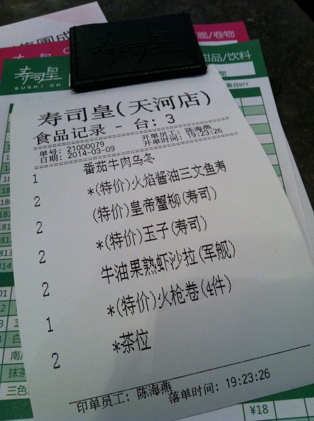 寿司皇——三文鱼特长寿司      此处地方是很好的地方,都是在天河最旺的市区。而且是逛街好地方。吃饱可以做做吃吃,吃完又可以运动下。而且如果是大热天也不用怕。由于是在商场上的,空调可以覆盖着。哈哈。     环境就是多人,不过空气是不错的,由于天河城这里,逛街一层,吃东西一层,所有互不干扰,挺舒服的,经过了寿司皇,此招牌夺目哦。挺耀眼的,又想吃寿司所有就吃上吧。等了基本15分钟,终于有位置啦。先坐下来叹杯茶先,之后看看这里的有什么特色的寿司我是没有吃过的,哈哈。还是终于三文鱼,吃多点三文鱼,对于女士来说不会肥,而且脂肪不会聚集的,所以可以放胆吃噶。哈哈。不过看到价格上还是略有贵点噶。     看到特色的,第一眼看到我就忍不住啦。点了个特长的三文鱼寿司,看它究竟有多长,哈哈。确实。三文鱼的长度是比普通的长三分之一噶。哈哈。如同一条金鱼在我面前,之后我点下芥末。一口放到嘴里,天啊。我的口没有那么长,还漏了尾巴的三文鱼。嘻嘻。最后把它给塞进去啦。哈哈。吃的很爽噶。一口都是三文鱼的鲜味噶。他们此处还是挺多寿司的,三文鱼也有很多品种的。     卫生很好,服务员待人还是连带笑容的,可爱可亲。查看更多