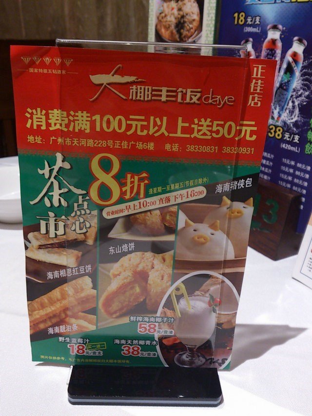 大椰丰饭,虽然说是打折了但是对于学生党来说有点贵,普通菜式价格都比较贵,那些高档的看都不敢看了,太贵。在正佳这里环境卫生各方面都是不错的,人不多所以比较安静,空调挺凉快,在这里面坐着很舒服,服务员有点冷淡不爱笑。个人还是比较喜欢文昌鸡,88块钱,平时吃清淡一点的朋友应该都会喜欢的,鸡肉味道比较淡,鸡肉新鲜肉质不错,嫩滑嫩滑的,一点都不老哦,旁边的姜葱汁还有辣和不辣的,看个人口味把,最关键是鸡皮不油腻还吃起来爽口,一顿饭人均100+。查看更多