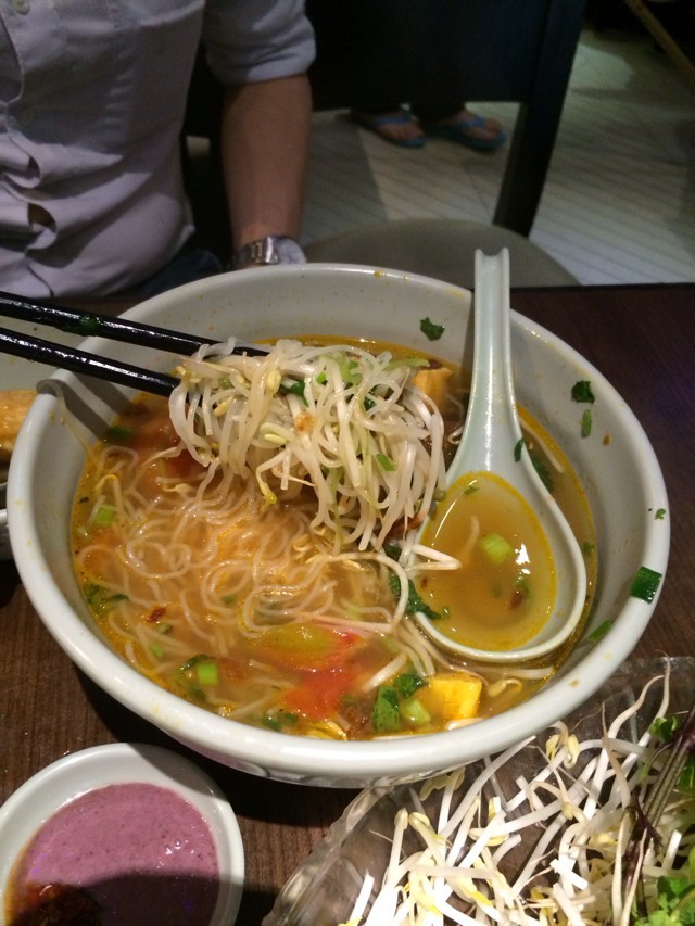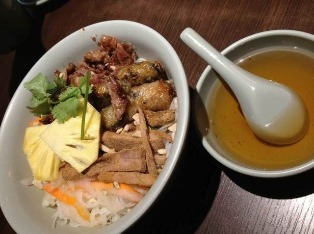 这家店十分多人光顾的,这里的店面挺大的,而且环境和灯光挺有情调的,但实际上却十分的吵,点了这里的檬粉,味道还行,味道甜中带辣,这个檬粉是带汤的,里面挺多辣椒的,粉不是细米粉的东西,里面还有叉烧肉、葱、少许的元西还有些豆芽、韭菜的,粉比较滑,汤会有点酸甜的,但是比较咸,分量也很多的。三个人吃绝对没问题的查看更多