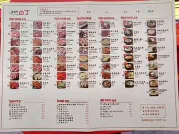 刀削五花肉 / 牛五花 / 雪花牛肉 / 小菜 / 泡菜年糕拉麵 / 雪花豬肉