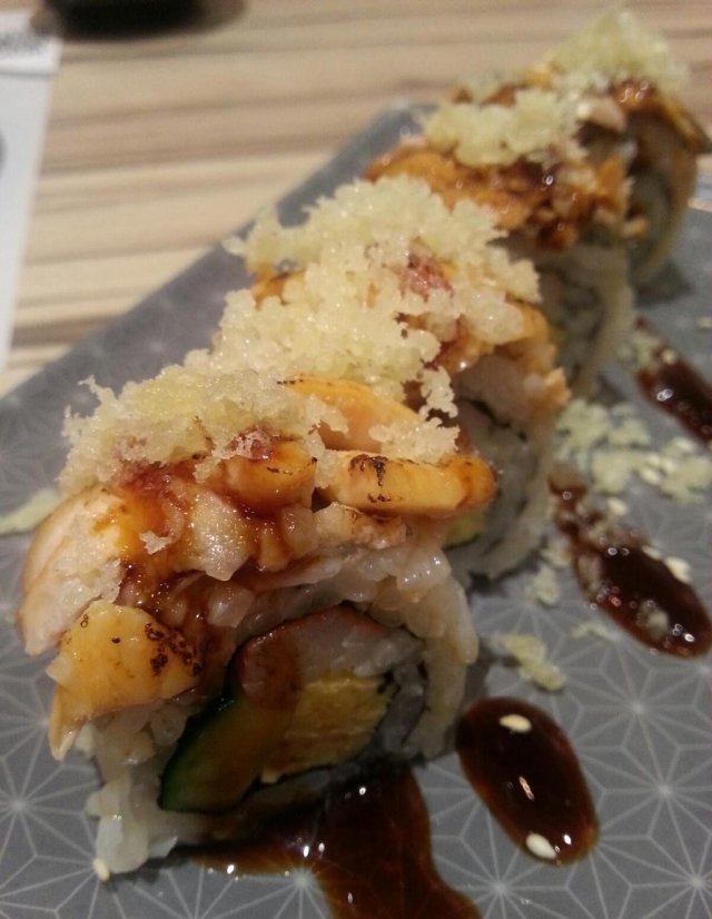 芒果寿司卷,看起来很不错,这个是特价的时候要的,反正不贵也就试试吧,芒果也蛮新鲜的,吃起来很甜,是感觉有点过甜的那种吧,可能因为饭正常来吃是咸味的,所以这样的搭配似乎有点不习惯了,反正这样吃起来就很甜,我和朋友都无法接受这样的味道。但饭还是可以的,不容易散,味道也还可以,有醋的香味。查看更多