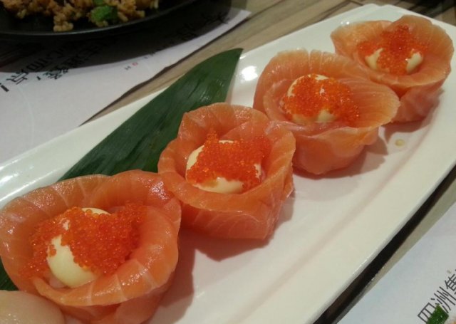 寿司皇最近经常去开的,也算是比较熟悉了吧,各方面都没有什么弱点,食材也是比较放心的。三文鱼鱼生我是每次都不能少的,他家的三文鱼片的特别的薄,每一片都是差不多的,吃起来更加的有弹性,而且质感甚是光滑。花之恋也蛮不错的,这个三文鱼就要厚切很多了,而且沙拉酱和蟹子的量都挺合适的,吃起来很清爽。查看更多