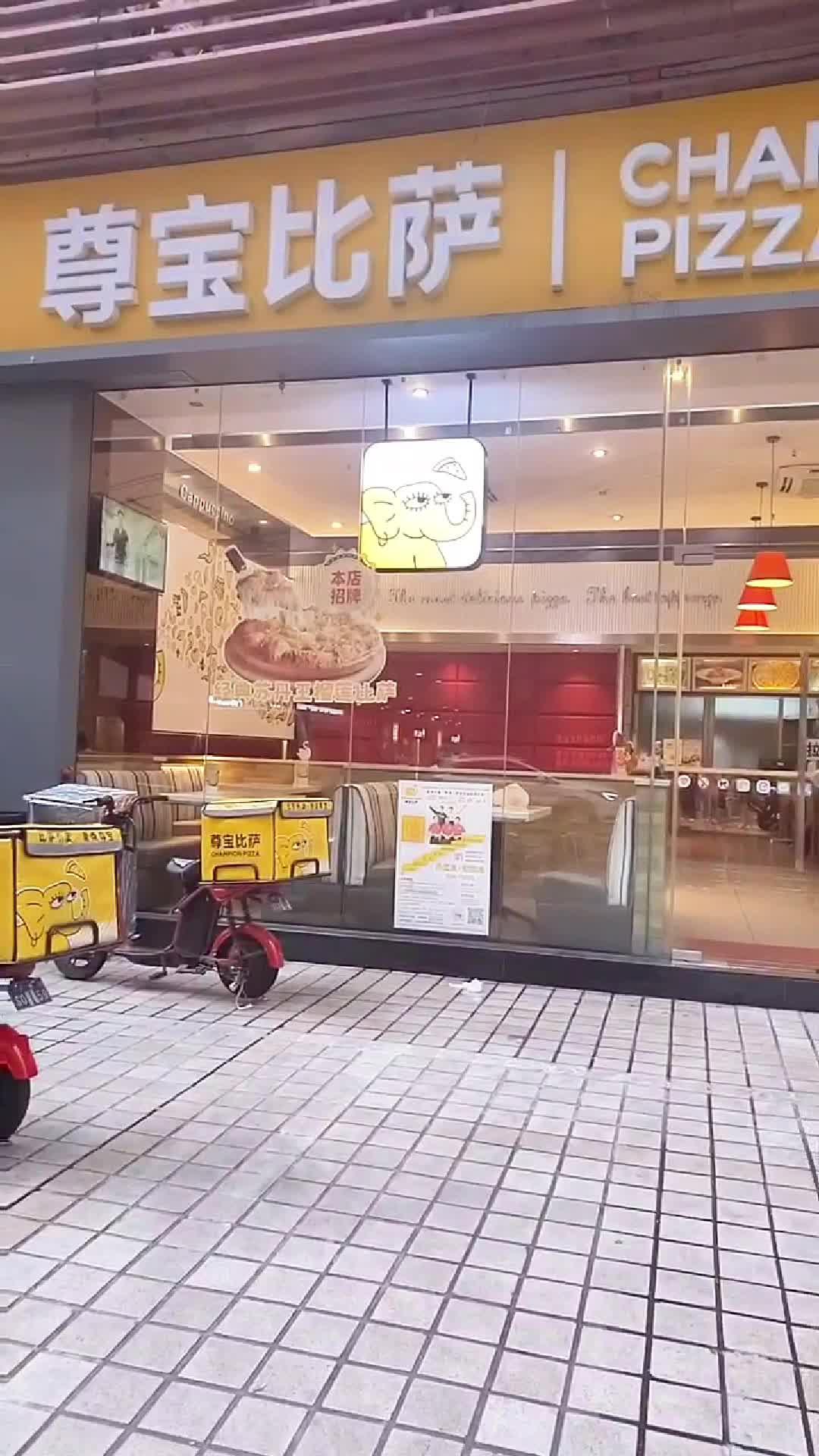 本次的双人餐价值113元,售价67元,折扣不算十分诱人,但是人均33.5元吃洋快餐而且内容还挺丰富还是可以接受的,看了团购详情后,我便又狠狠地掏了一下钱包。(1)尊宝比萨:12寸,口味的话,只要是餐单上有的可以选,有16种选择,其中3款式辣的,我高中同桌不吃辣也不怎么吃海鲜,所以最后选的就是最中规中矩的超级豪华比萨,就是那种什么都有一点的口味。比萨是纸盒子盛着盖好端上来的,一打开,确实还挺诱人,比萨面上有肉丁、菠萝、红椒、橄榄、洋葱,当然还有我最爱的芝士!一个比萨分切成了12小块,方便取食,一口吃下去,面饼厚度适中,不会有那种厚得让你像在啃烙饼的感觉,也不会薄得托不起食材,芝士的味道挺香,各种食材搭配起来的味道都不错,真的就是中规中矩,火候掌握得也不错,不会有烤糊的味道。(2)骨肉相连:4串,味道不会很咸,吃起来还可以,是拿锡纸盒盛着并盖着纸盖子端上来的,刚拿上来的时候就不是很热乎,估计是买现成的然后微波炉加热的吧。(3)新奥尔良烤翅:2个,也就是把一根翅膀劈成两半,同样是用锡纸盒装着盖着纸盖子端上来,同样不热乎,估计也是微波炉加热的类型。味道嘛,跟K*C的差不多。(4)饮品:可口可乐或者酷儿二选一,我们都选的是酷儿,只有香橙口味,橙子味比较淡,普通的汽水饮品,解渴还凑合。以上就是67元团购所含的内容,我和高中同桌将全部食物一扫光,其实主要是我吃的多,我同桌吃几块就喊饱了,我把剩下的都搞定后也觉得很饱,所以食量不会特别大的女生二人组还是比较适合这个团购餐的。这家貌似做外卖比较多,就餐的过程听到好多外卖点餐电话,也许这就是为什么所有食物都是以随时可以外卖送出的姿态呈现在我们眼前的原因。餐厅的位置:在时代广场与河涌之间的那条路走进去,一过时代广场右手边的一条路上就能看到尊宝的招牌了。餐厅的装修比较简约,给我感觉蛮舒服,还有播放一些轻松的音乐。我是工作日去就餐的,人不多,相对比较安静。