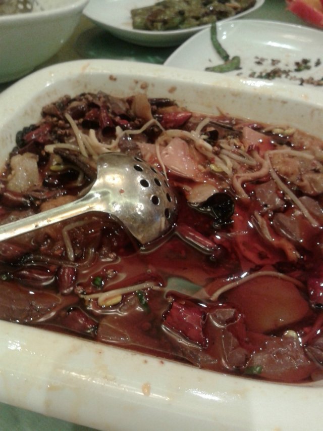 C妹子生日大餐在这里定了包间,餐厅环境很不错,干净优雅,古色古香,很符合C妹子一如既往的审美观。包间空间还是挺大的 ,有电视看,座椅很舒服,房间还有足够的空间给大家放礼物……菜都是提前订好的,只等人齐就可以开始上菜了。因为一起的朋友都喜欢吃辣,今晚的菜都是以川菜为主,大部分上桌都是一片红艳艳~~~~古法水煮鱼:据说是招牌……鱼肉挺鲜嫩,不知道是不是特意加麻加辣,平时很能吃辣的我也不敢多吃,太辣了~~~最下面的豆芽和酸菜超好吃……我和ZZ、w都边喝水边吃好多~~毛血旺:上面那层辣油+N多的干辣椒就让我不是很敢吃……而且刚刚才吃完牛杂,对这个也不是很有兴趣……里面的鸭血很不错,吃了两块,爽口。不知道名字的骨架:应该是先炸过然后在稍微蒸一下就上碟了。看上去很上火,闻起来很香,胡椒和孜然的味道挺重的,吃起来很辣,而且肉有点干了咬起来觉得老,还不方便吃,因为每一块都切得太大块了,但是伴碟的炸辣椒好好吃,够香脆,可惜不敢多吃……夫妻肺片:香!辣!麻!但是肺片不够脆,不是我的菜……(更重要的是太辣了,吃一片喝了几杯菊花茶)虎皮尖椒:这个辣椒吃起来居然不怎么辣,而且煎得刚刚好,超下饭,我一个人吃了差不多四分之一碟去了。虾很虾,入味,蒜蓉很想,香脆可口,可惜太少了。芹菜腰果炒百合:和虎皮尖椒、炒时蔬是全席全部的青菜了……腰果很香脆,百合鲜甜,芹菜不爱吃……其他还有水煮牛肉、爆炒田鸡等菜,味道不错,就是太辣了,吃到后面都感觉吃不出什么来。查看更多