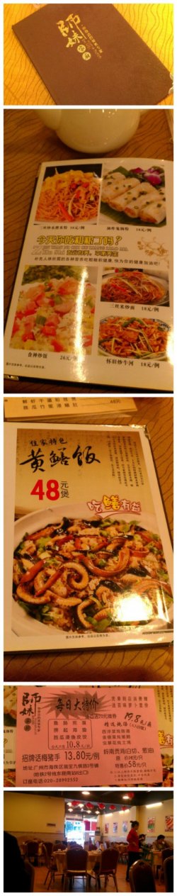 某日中午在东晓南地体站附近收到一张传单,原来是“师妹家厨”正在做优惠活动,还是蛮优惠挺心动的,于是打消煮饭的念头跟老公出去消费了一次,结果,结果就没有下次了。 先给大家看一下【菜牌、传单和环境】 整体价钱不是特别便宜的那种,感觉就是我们这些小朋友不会光顾的饭店,只是传单实在吸引,当天也有很多人在就餐,每一桌都有传单里面的特价菜,呵呵,看来宣传效果不错呢。 传单写得相当的吸引,话梅猪手13.8,还有三款是10.8的,而且消费就送百味萝卜。 ★坑爹的部分来了★ 当我跟老公兴奋的打算order所有特价菜的时候,师妹家厨的服务员才告知:必须点一份正价菜才能点一份特价菜。 忍着了当场爆粗的冲动,我们淡定的,优雅的点了一份六人份的黄鳝饭,价值48大洋,然后终于可以得到一个特价菜的名额了,经过再三商量,这个名额谨慎的交给了价值10.8大洋的【胜瓜浸鱼皮饺】,接下来就是等待,等待,以及四处观望了。 装修走的是平实的风格,在我看来就是半大排档的设计,没有故意走什么华丽的风格,平常的话我是绝对不会想到要去就餐什么的,从拿到传单决定去“捡便宜”的一刻开始,就注定了今天是我们活该被坑的日子了。 赠品 赠送的除了传单上注明的百味萝卜,还有西米露 西米露很稀,没有椰汁味,不过对于赠送的东西,大家一般都是没什么要求的。百味萝卜很奇怪,老公说有点像拿酱油腌制的,他还有点挺喜欢的。 黄鳝饭 虽然说,图片和实物是有差距的,但是也没理由相差这么多的吧,黄鳝切得很小,很小,很小……几乎每一口都有黄鳝,几乎每一口都无法感觉到有黄鳝的存在…… 平心而论,这锅黄鳝饭是挺香的,还有一点点的饭焦,只是本人吃不惯没有肉的煲仔饭…… 胜瓜浸鱼皮饺 特价菜,10.8,老实说,感觉是最划算的了,虽然图片看起来没什么料(已经被我们装了两碗了),但实际上味道还不错,也有十只左右的鱼皮饺,胜瓜的分量也还可以,主要是对得起这个价钱。 最后还收了茶位费,好像是每人两元的样子,就是消毒餐具的费用吧。 如果没有优惠,我是完全不会考虑这家师妹家厨,如果还是这样的优惠,我也不会考虑了。