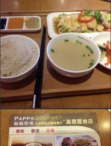 从前的帕帕珍味好像只做香啡包的,有巧克力味的,有馅心的,价格不贵,才8元一个,就那么一两款面包。一间既不是面包店,也不是咖啡厅,就像是一间休闲下午茶餐厅,现在却做成一间类似东马亚菜的餐厅。此次品尝的这道海南鸡饭,价格有些贵,一个套餐将近五十元,之前吃的时候可以送一杯饮品,现在不知道还有没有这个优惠。一碟海南鸡,一碗鸡汤,一小份青菜,一碗鸡油白饭,除了最大的份海南鸡之外,其它的份量都相当精致,唯独比较可惜的是,海南鸡的肉质过于粗糙,几乎都是肉质厚实白皙的鸡胸肉,吃起来没有鸡皮爽脆鸡肉嫩滑的口感,鸡味不是十分浓郁,倒是那碗鸡油饭令人回味。…查看更多