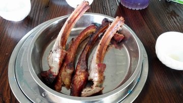 招牌摆在路边,这家大排档感觉像新开不久,太过简陋了。【烧排骨】菜单上没有的,忘了多少钱。一般,吃过比这个好吃的烧排骨。【玉米煲瘦肉汤】晕!怎么菜单上又找不到的,所以价格也忘记了。家常的一道汤,里面放的某种材料,看上去像姜又不是,忘了名字,据说是祛湿的。【铁板牛肉】 38元牛肉很大块,可惜没有几块啊,而且有些还是筋一样的部位,有点嚼不动,味道还不错。【上汤蔬菜】菜单上没有,忘了叫什么蔬菜,分量倒是挺多。【紫金酱蒸鱼头】 38元应该是叫这个名字吧,紫金酱,名字听上去很高大上,好像就是豆酱吧。【炒粉丝】没吃饱,叫了炒粉丝,里面放了火腿肠,味道还不错。