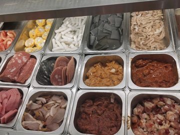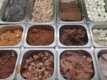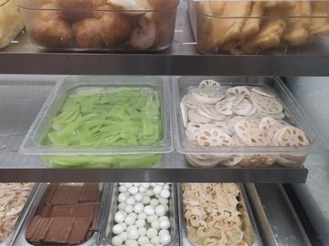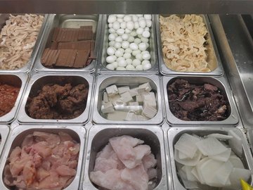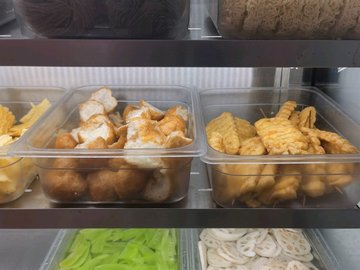 咖喱魚餅 / 黑椒雞肉片 / 素雞腸 / 包心魚丸 / 龍蝦球 / 蛋餃