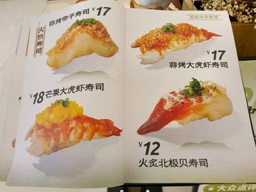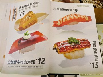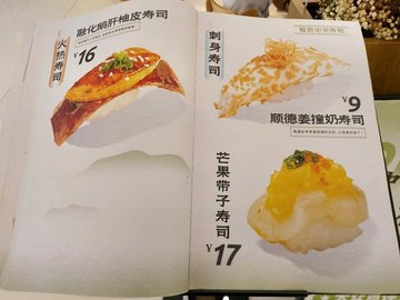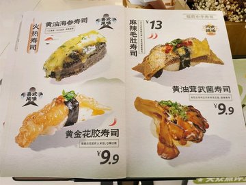 油燜鮑魚壽司 / 火炙牛舌壽司 / 蔓越莓開心果牛肉壽司 / 冰皮榴蓮壽司 / 天婦羅南瓜蟹膏壽司 / 皮蛋三文魚壽司