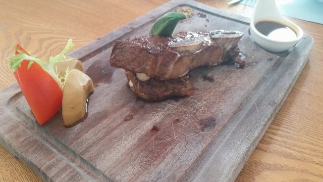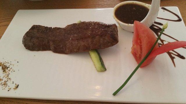 吃完前菜,今天的重头戏来了——牛扒。今天试吃的牛扒有3款,首先吃的是5A雪花牛肋骨皇,用了番茄,莲藕,秋葵伴碟,造型不错。牛肋骨大概有7成熟,牛味十足,靠近骨头带筋的位置有点韧。搭配的酱汁有黑椒汁和海盐。蘸海盐吃味道会更好。 雪花霜降7A和牛现在特价1元1克,100克起计算。如果是烤焗牛肉会更富有嚼劲,如果是石烧,就能保持它肉质的鲜嫩,而且也比较容易控制它的熟度。为了对比,我们两种煮法都叫了。 烤焗7A雪花和牛,日本的和牛从高到低共分为五个等级A5,A4,A3,A2,A1。其中A5级的和牛可以说是最顶级,但这里所说的7A,感觉与我所知道的等级有所不同???但不管了,先来尝尝味道,牛扒同样是7成熟,切开来可以看见纹理清晰,吃上去口感嫩滑,比牛肋骨的味道更好。 石烧7A雪花和牛,这个是由厨师现场烹调,用高温烤过的热石对牛扒进行煎煮,煎的过程中洒上少许的岩盐,很快就可以上桌了。这样煮感觉比烤焗要好吃,不用蘸任何的酱料,直接吃用,保持了原有的肉汁鲜味,如果怕生的话可以再放上热石继续煎煮,自由控制它的熟度。 果香自然猪肋排,很大的一块,切开来每人一根,吃上去感觉不像是猪肉,很嫩,还有很香孜然和酱汁搭配在一起。 烤焗德州自然猪肉眼,由于吃得太饱了,这个就没有位置再品尝,不过听其他人的反馈,味道也不错。 饭后甜品,冰镇原只椰奶木瓜捞,里面内有乾坤,有西米、红豆、珍珠等等,原本木瓜和椰奶都比较甜,再加上多种的配料,感觉更甜了,反而影响了口感。 总体来说,这里的牛扒还不错,而且价格也适中,除了牛排还有多种的套餐价格都比较优惠的,比如单人套餐78元或者是98元的,所包括的食品有面包,汤,主食和甜品。另外还有团购的特价优惠。值得下次再来品尝。…查看更多