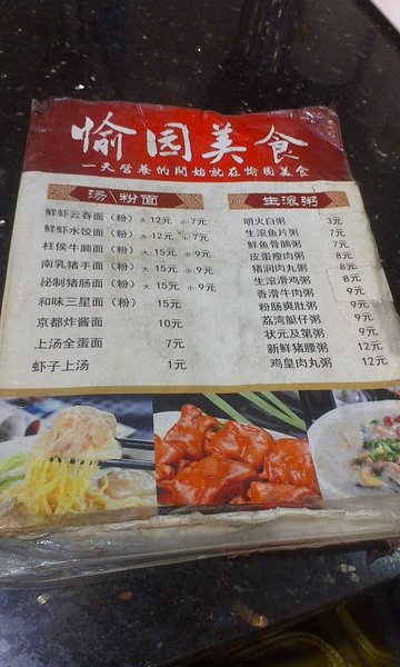 这家愉园美食是开了很多年的老店,环境一般,装修是那种大排档的风格。他家经营粥粉面饭,品种还是不少的;顾客还很不少,有很多还是附近的街坊。吃了个他家的鲜虾云吞面,里面有五只云吞,每只云吞都有一只大虾,而且肉馅是肥瘦搭配适中的猪肉馅,所以云吞非常好吃。面是碱水面,非常之弹牙。汤底是采用传统做法,用猪骨汤、大地鱼等熬制出来的,还加了韭黄、虾子等,而且没有放味精、鸡精之类的,喝多了也不会口渴。至于,他家的碟头饭也有很多人吃,估计应该是不错的。…查看更多