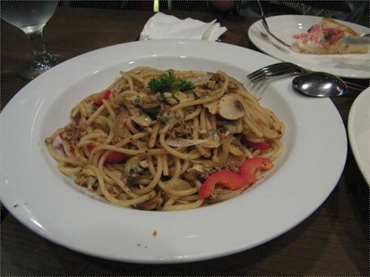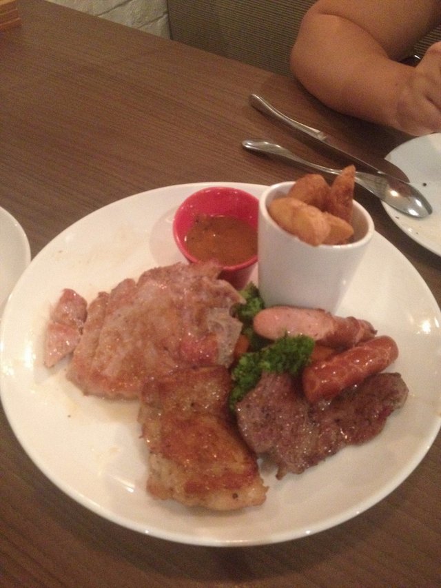在天河城看电影,还有一个小时就开场,只能在天河城吃了,朋友说之前吃过这家蛮好吃,只有去试试的份。环境倒是蛮不错的。但是看餐牌,就觉得贵。随便一个意粉都要52+,看到隔壁桌的盘子好像挺大的,三个人点了两个意粉,一个杂扒。上菜速度还可以,上菜一看,意粉分量很少,所谓盘子大分量少就是这个。一个人吃一个都不饱,郁闷,因为贵,也没时间,随便吃吃,墨汁意粉味道很淡,问服务生有没有什么酱汁可点,最后的答案是不了了之。黑椒意粉味道还可以,牛柳很嫩,这个还不错,但相比普通的意粉店,是人家的两倍价钱,贵啊。杂扒,没吃过这么难吃的,鸡扒都是老的,牛扒都没有问我们要几成熟。猪扒老到咬不动,难吃死了,差评。最后,问服务员有没有什么优惠结账,服务员才告知用中信信用卡结账或者加微信可以打九折,这不是应该主动告知吗?服务做太差了,不会再去了。…查看更多