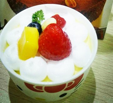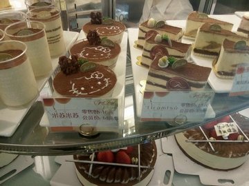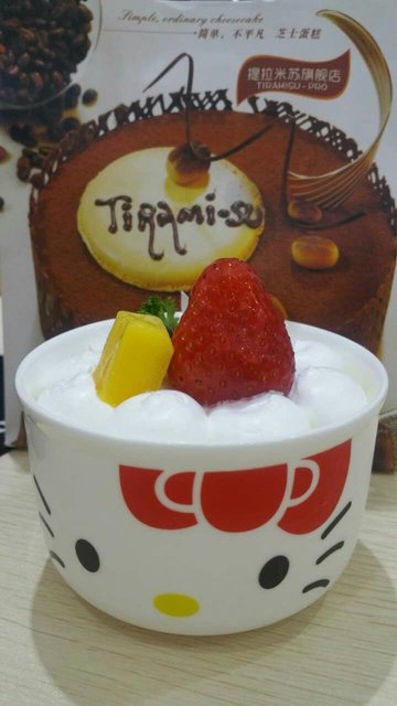 放学感觉嘴馋看到这店有很多人在排队就去看看了~这店室内面积比较小~其实门面也不大~但是麻雀虽小五脏俱全~~店内的蛋糕琳琅满目~样子做得非常吸引~但是店员人数很少·10几个客,只有一个人在伺候~都忙不过来了~但是店员看起来还是挺有热情的~态度还不错~我点了一款很可爱的提拉米苏~用Kitty杯装着的~草莓好鲜甜~~味道很好~~忌廉好香滑~融在口里味道好极了~~提拉米苏真心做得不错~~芒果口味的~~味道香浓~