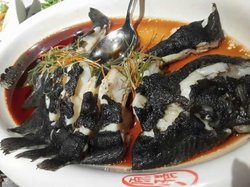 这家酒家的环境还可以,装修得有点西关的古典味,藤椅有点古朴,在黄埔的酒家来讲算是比较OK的一间,出品味道还可以,价钱中等。清蒸海鱼,条鱼都几大条,个外形有点像魔鬼鱼,因为肉身比较厚,条鱼仲切成一大块一大块的,肉质比较嫩,不过不太滑,感觉一般,沙姜捞鸵鸟肠,除了沙姜外,还加了蒜蓉、香茜等去捞,味道都算香,口感要比猪肠要好点,不会太韧,清洗得还算干净。