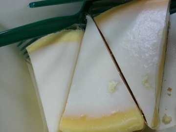 第一次吃他家的芝士蛋糕,原来还是非常不错很不错的。不过好像不是星爸爸自家做的而是由美心提供的。这款芝士蛋糕的芝士味很浓,质感很实在又顺滑,重点是里面应该还加了一点柠檬汁,吃到一半会有一点柠檬果酸的味道可以很好地接腻,可以多吃几口。下面有比较薄一片的硬饼底,不会很甜。总体很赞~