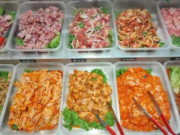 黑胡椒拌肉 / 西冷牛排 / 安格斯牛胸口 / 奧爾良雞翅 / 口蘑 / 牛仔粒