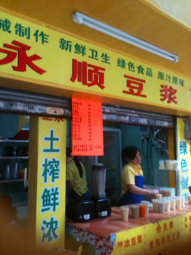 这家永顺豆浆是在德政北路,明记甜品往北走,才福面家的对面,店面算是比较老旧的,但是比较显眼,因为旁边没有其他店铺。之前光顾过它家一次,不过是在早上,这次也是碰运气的,以为它家只做上午的生意,原来是做全天的,还好没白走一趟。买豆浆的时候不会有太多客人,但是客人是陆陆续续的那种,我买的时候又来了一位客人,后来也陆陆续续有几位客人买豆浆。要了一杯黑豆浆,1.5元。跟老板说要热的,因为她手里的那些都是冰冻的,我不习惯喝冰豆浆,会肚子痛。但是老板还是拿了杯常温的黑豆浆给我,后来买的那位女顾客也想要热的黑豆浆,但也是拿到了常温的。好吧,可能是时间关系,现在只有常温的豆浆了。豆浆味道还算可以,有黑豆的味道,但是很淡,可能是黄豆和黑豆一起打的豆浆,没有自己在家打的纯黑豆浆味道好。…查看更多